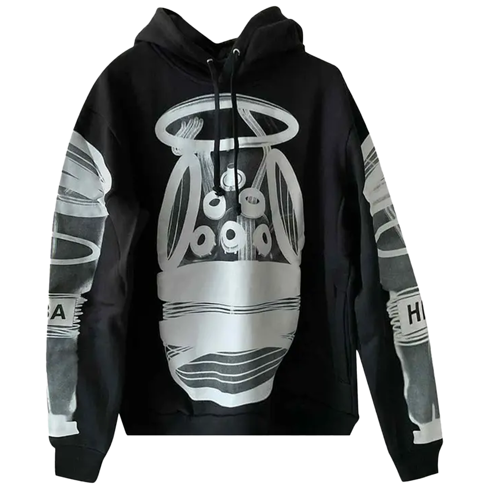 Heavyweight fleece, oversized fit. Monochrome graphic wraps front and sleeves with industrial surrealism. Drawstring hood and ribbed trims for structure. A bold statement in movement. HBA.