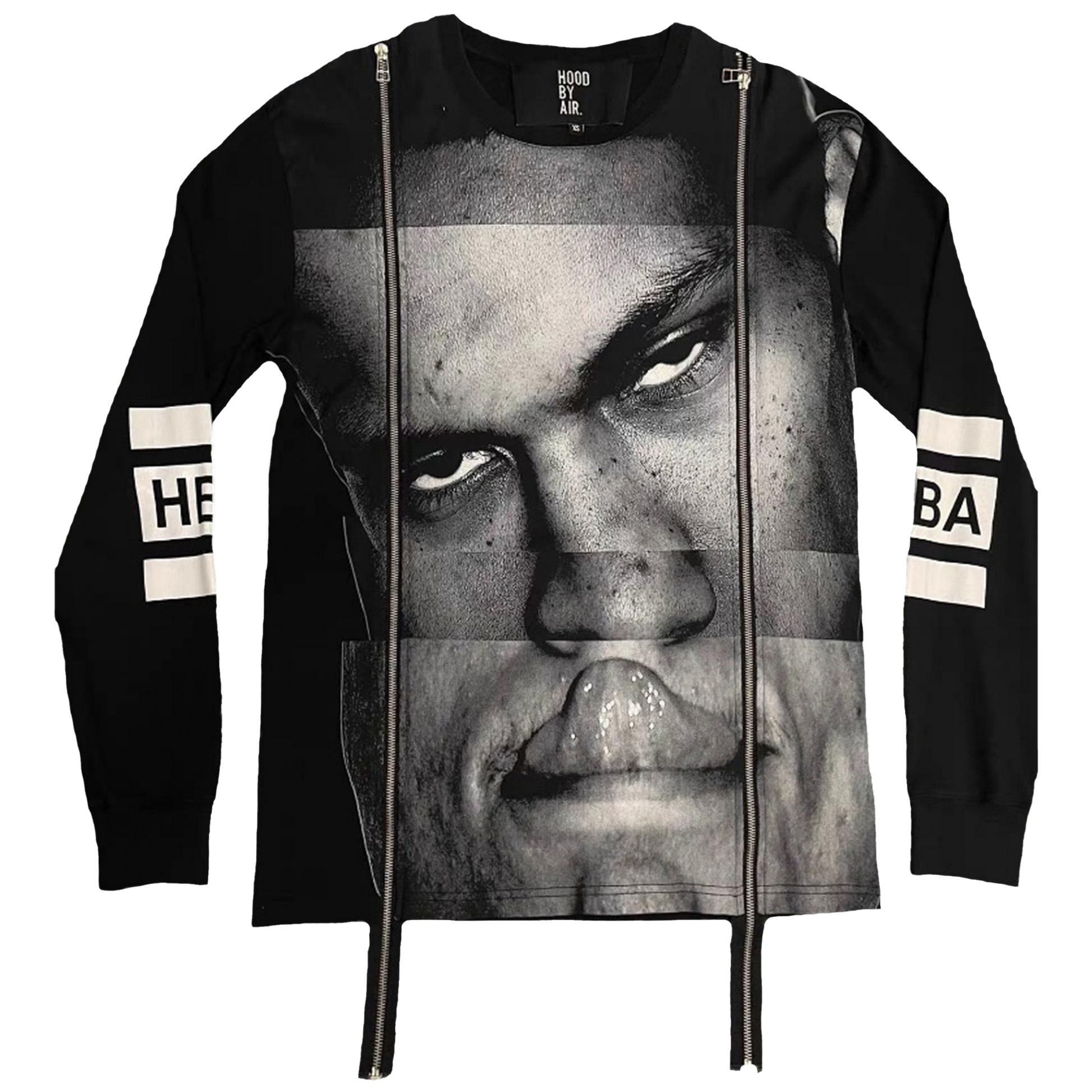 Long sleeve jersey with full-face distortion print. Fragmented portrait, locked gaze, unbroken tension. Dual vertical zippers slice the frame - not for function, but fracture. HBA insignia on both sleeves. Tight structure, loud presence. HBA.