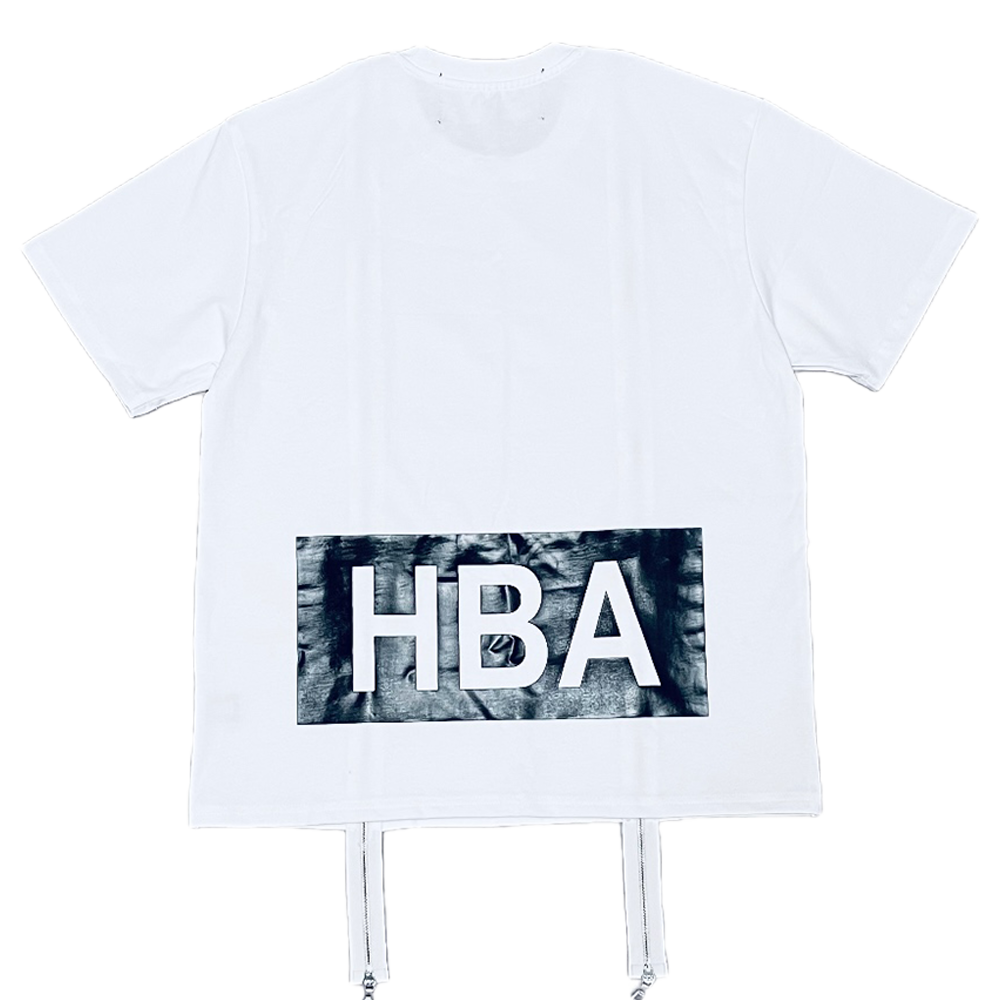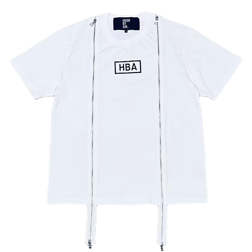 Cotton base cut through with vertical industrial zippers that extend past the hem. Minimal boxed HBA logo printed at chest, contrasted with an x-ray spine panel stamped boldly across the back. Hardware left exposed as both function and ornament, turning utility into statement. Clinical, stark, unmistakably brutalist. HBA.