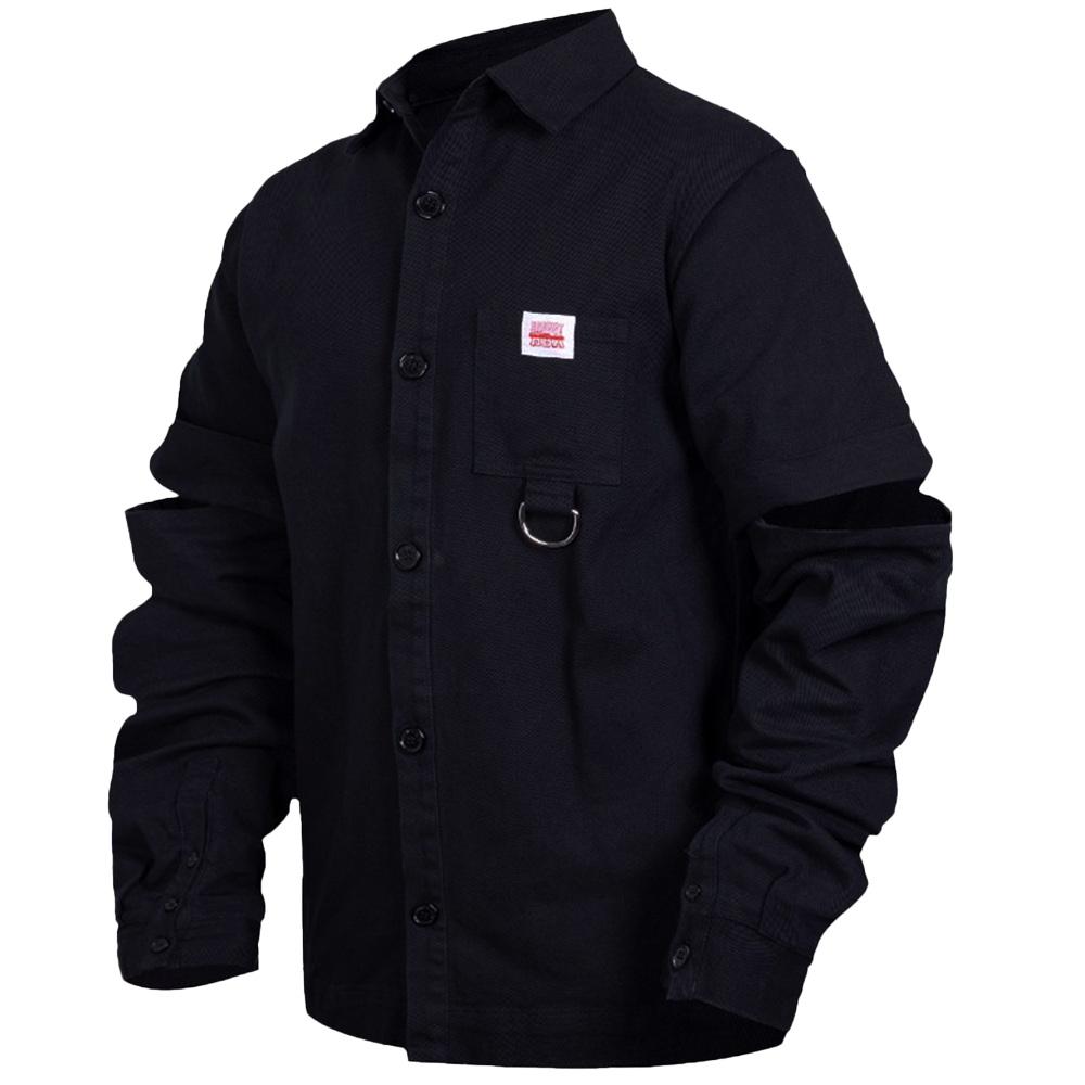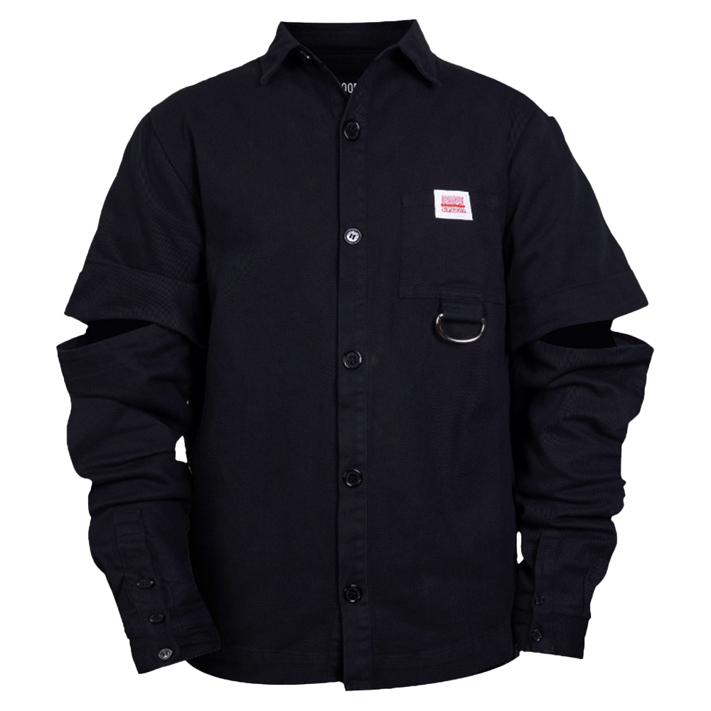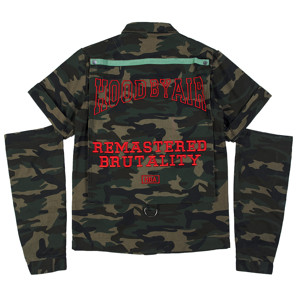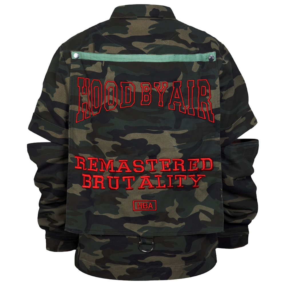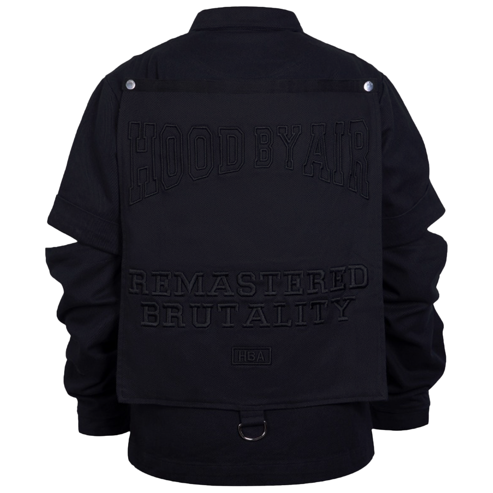 Structured cotton twill, detachable sleeves, industrial precision. Embroidered "REMASTERED BRUTALITY" back panel with bold HOOD BY AIR arch. D-ring detail and contrast chest patch nod to utility and rebellion. From FW2016 raw, tactical, elevated. HBA.