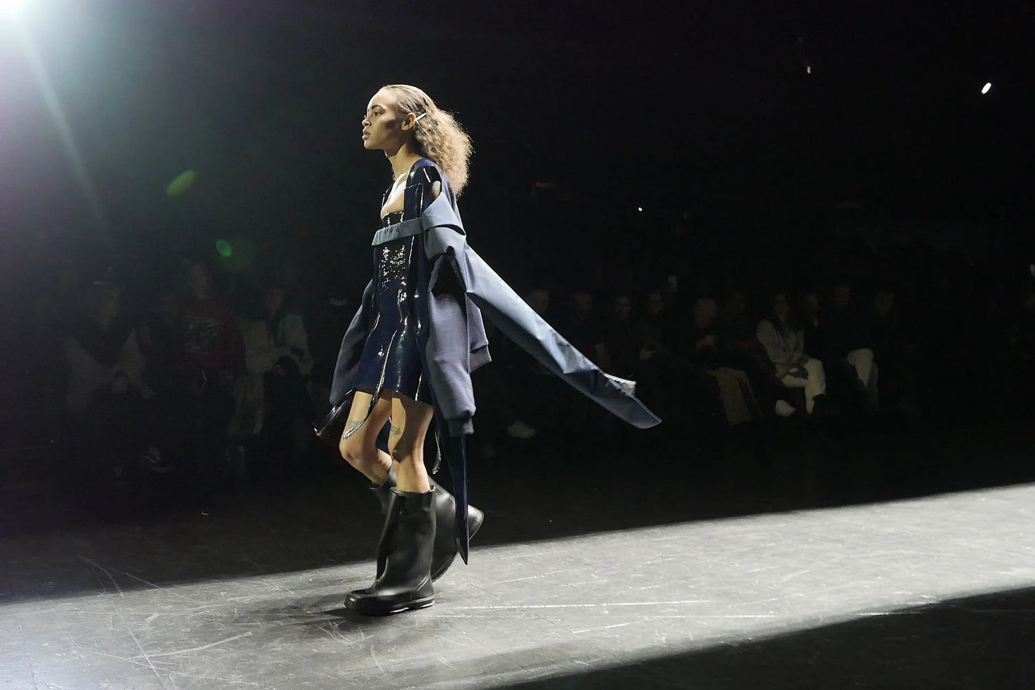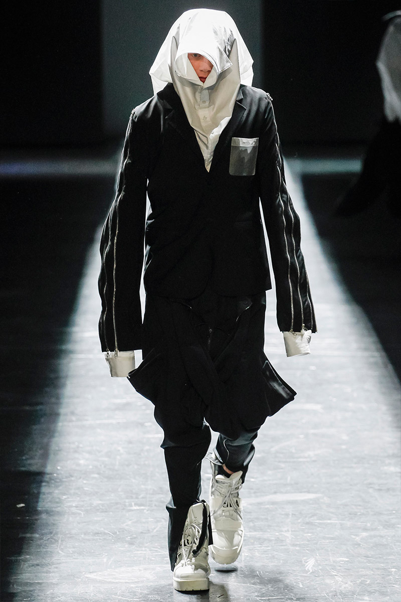FW16. Precision tailoring meets surgical distortion. Deconstructed form, layered aggression. Draped face hood, duality exposed. Power, unrest, structure undone. HBA. -